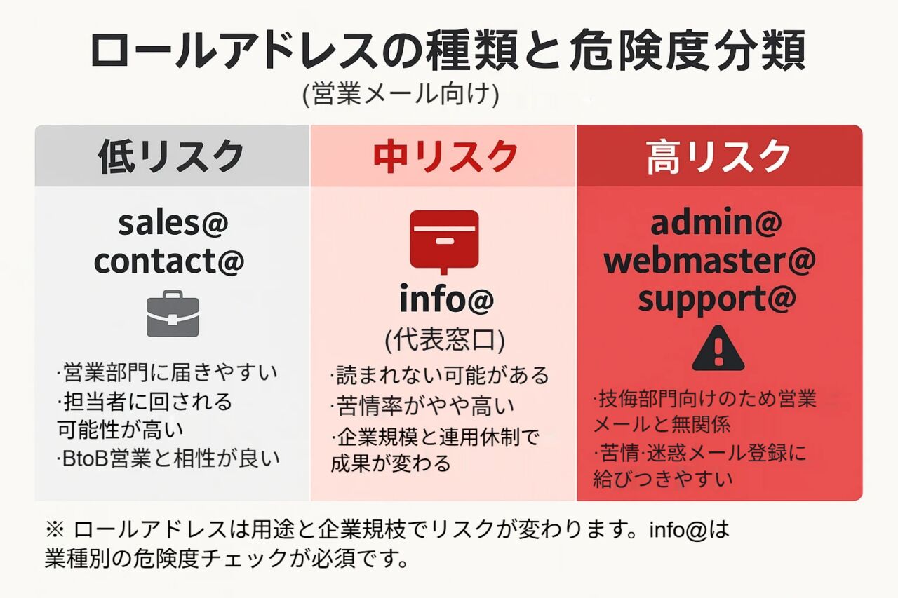 ロールアドレスは用途によって危険度が異なります。sales@のように営業部門につながるアドレスは低リスクですが、info@は企業規模や運用体制によって扱いが分かれます。admin@やwebmaster@は苦情率や迷惑メール判定が増えやすいため、営業メールでは除外推奨です。