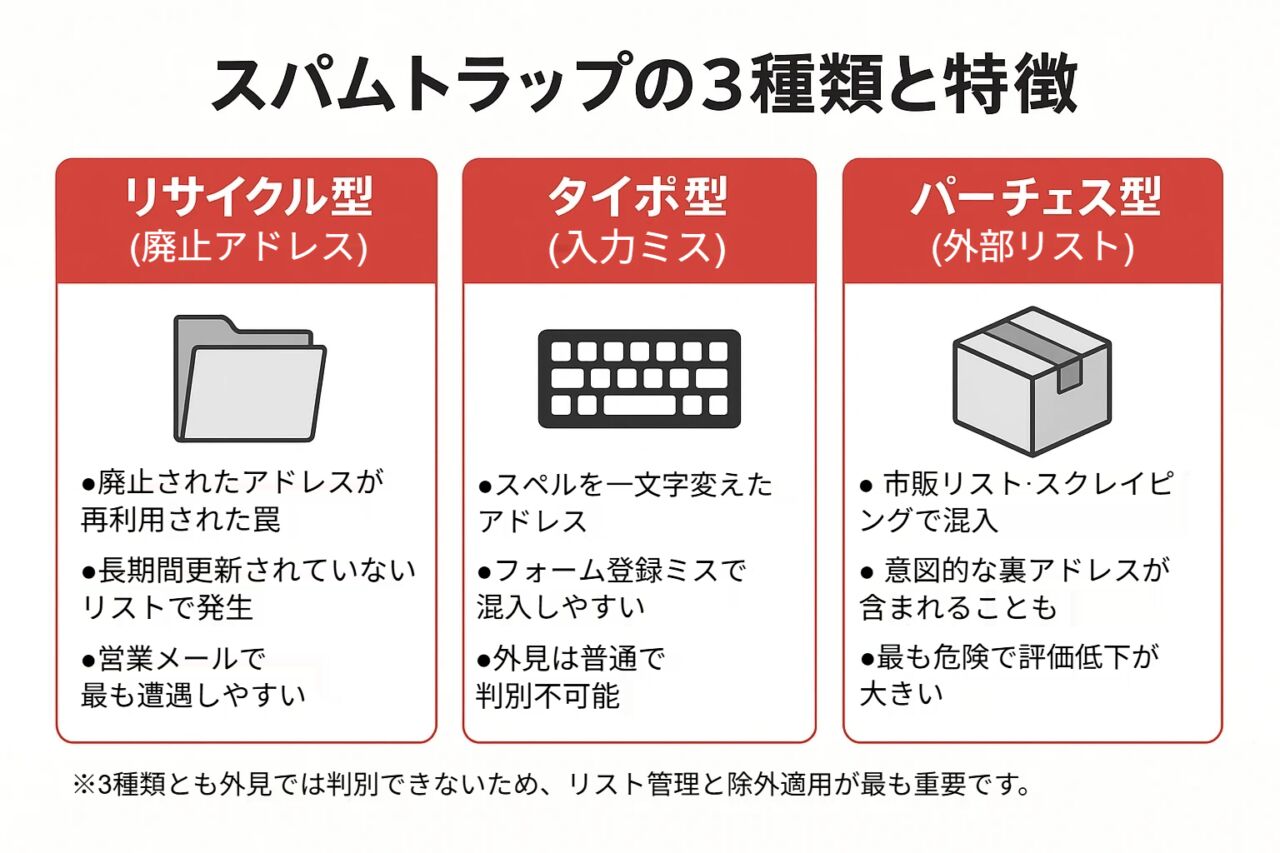 市販のリストやスクレイピングで収集されたデータに意図的に混ぜ込まれているタイプです。営業メールでは最も危険度が高く、誤配信すると短期間でドメイン評価が大幅に低下する恐れがあります。