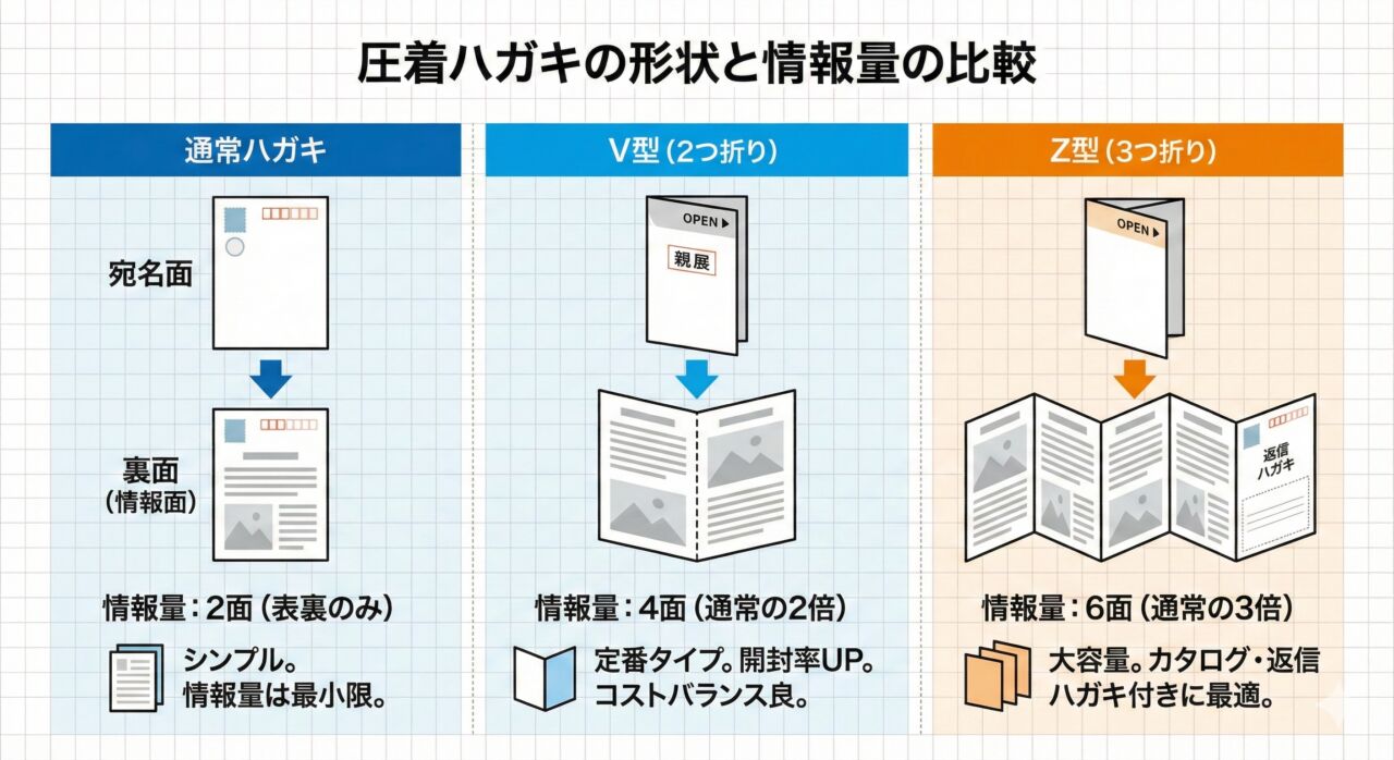 A. 掲載したい情報量で決めます。V型(二つ折り)はシンプルなお知らせや招待状向きです。Z型(三つ折り)はV型の1.5倍のスペースがあり、商品カタログや返信ハガキを付けたい場合に適しています。