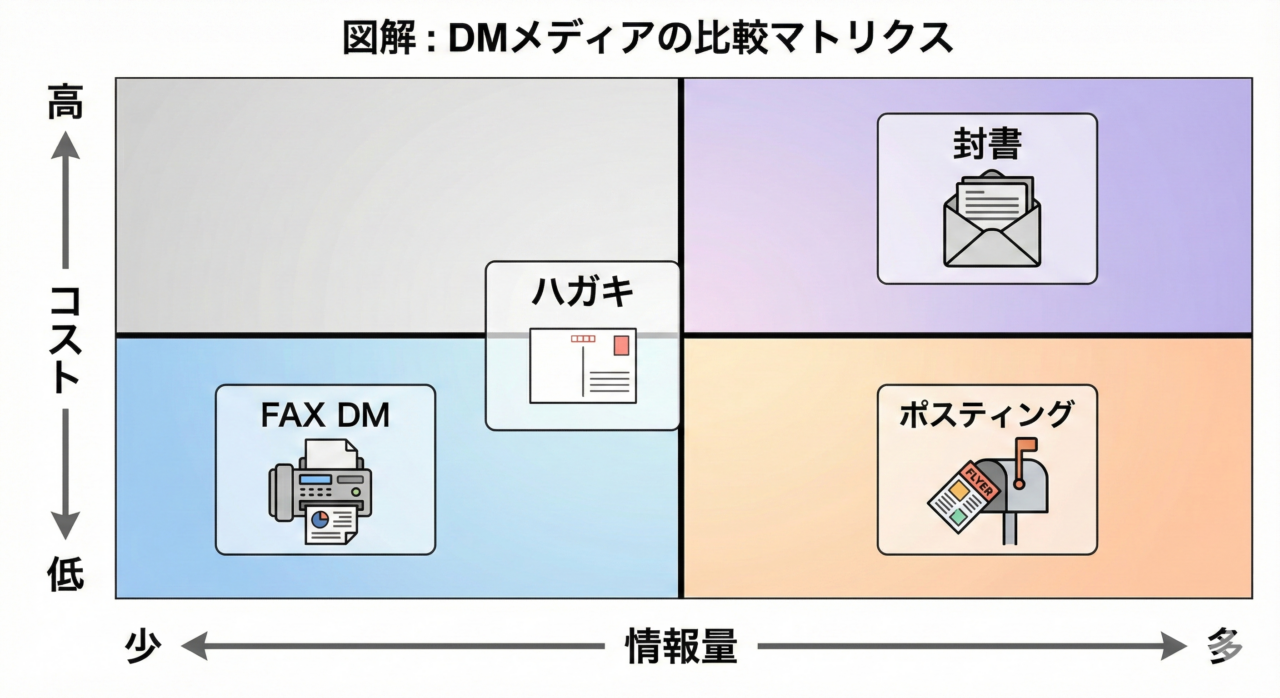 重要なのは、商材や予算に合わせて最適な媒体(FAX、ハガキ、封書)を選び分けることです。
