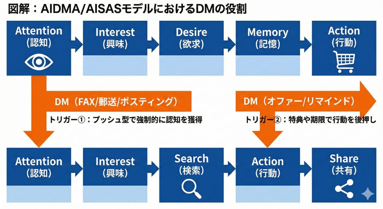 デジタル情報が溢れる現代において、物理的に届くDMは希少性が高く、決裁者の手元に残りやすい媒体です。特にBtoBでは、Web検索しない潜在層へのプッシュ型営業として不可欠です。DMの定義と、メール営業との役割の違いについて解説します。